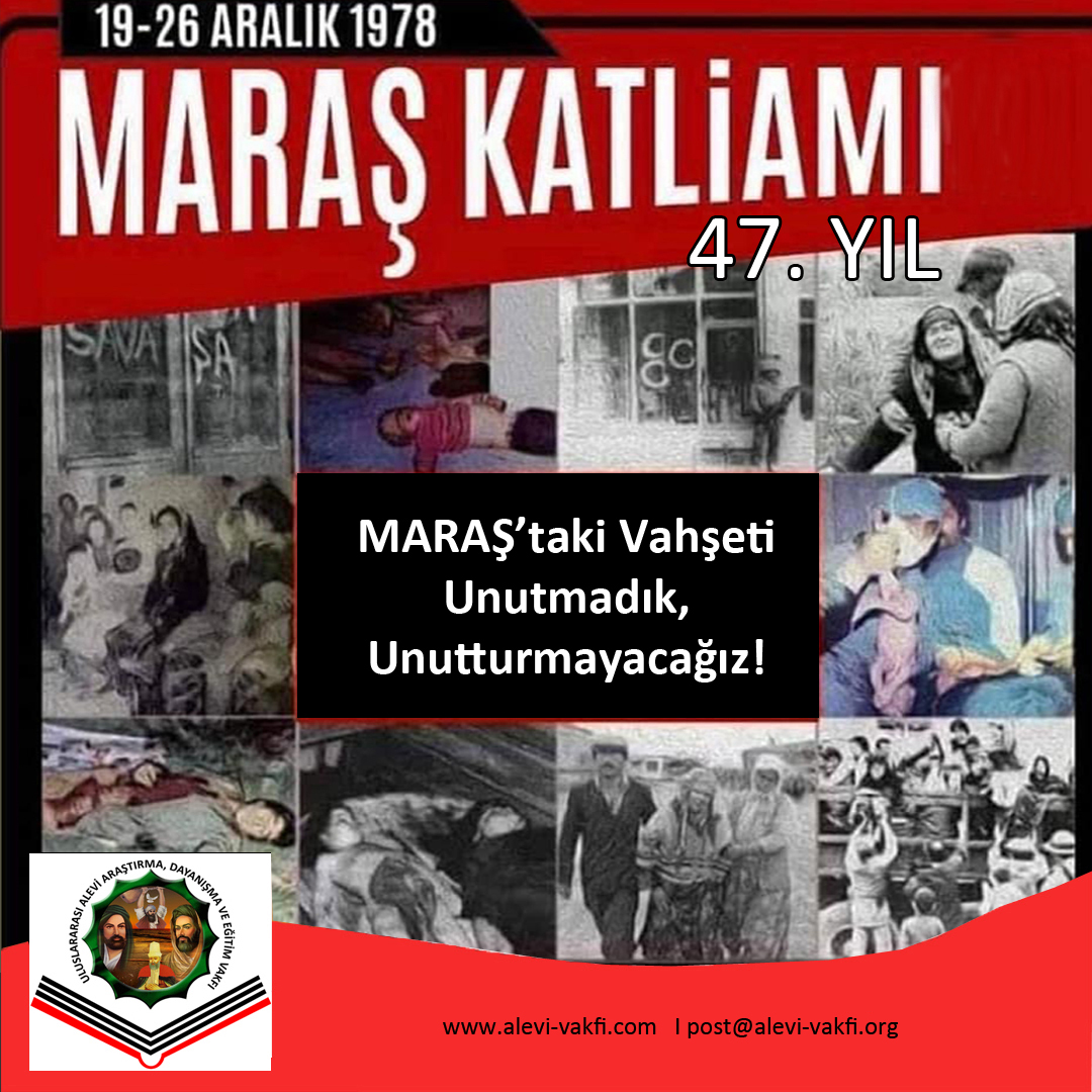 19 Aralık 1978: Maraş Katliamı. 19 Aralık ile 26 Aralık 1978’de Kahramanmaraş’ta meydana gelen Alevilere yönelik katliam. Resmi rakamlara göre yedi gün süren olaylar sırasında 120 insan öldürüldü. Ancak resmi ölü sayısın çok üzerinde insanın katledildiğine dair ciddi bilgiler kanıtlanmıştır.